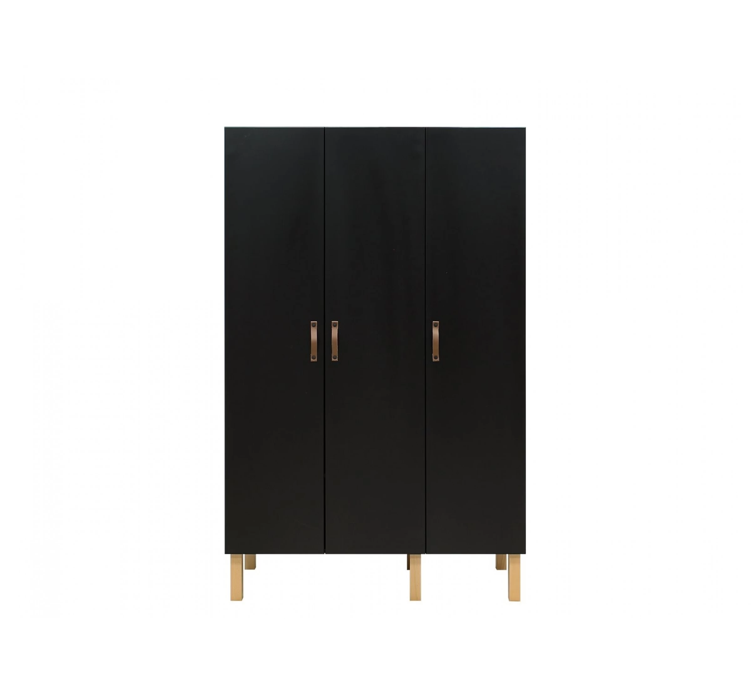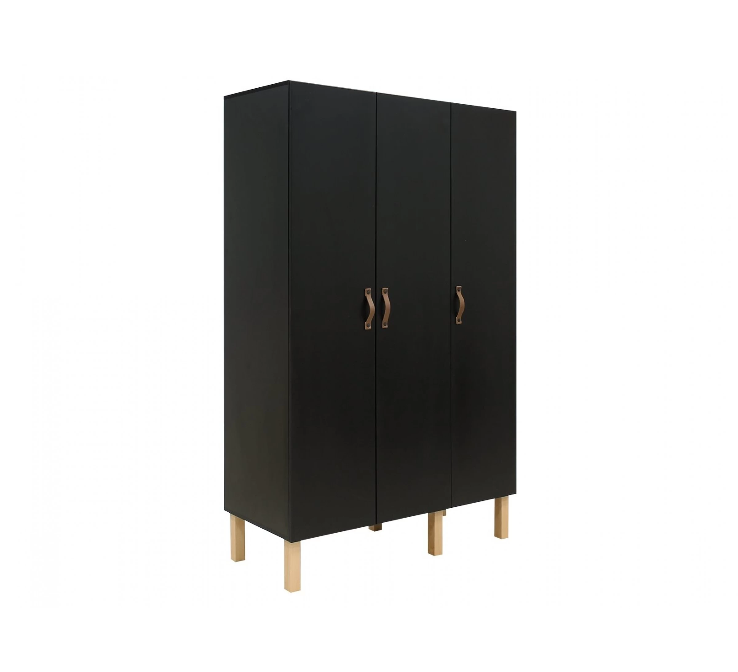 De 3-deurskast van de serie Floris is voorzien van leren handgrepen. De pootjes zijn uitgevoerd in beukenhout. De kast is afgewerkt met een lak op waterbasis die milieu- en kindvriendelijk is. Achter de linkse en middelste deuren bevinden zich twee legplanken en een hangroede. Achter de rechter deur geven de vier legplanken extra veel opbergmogelijkheden!