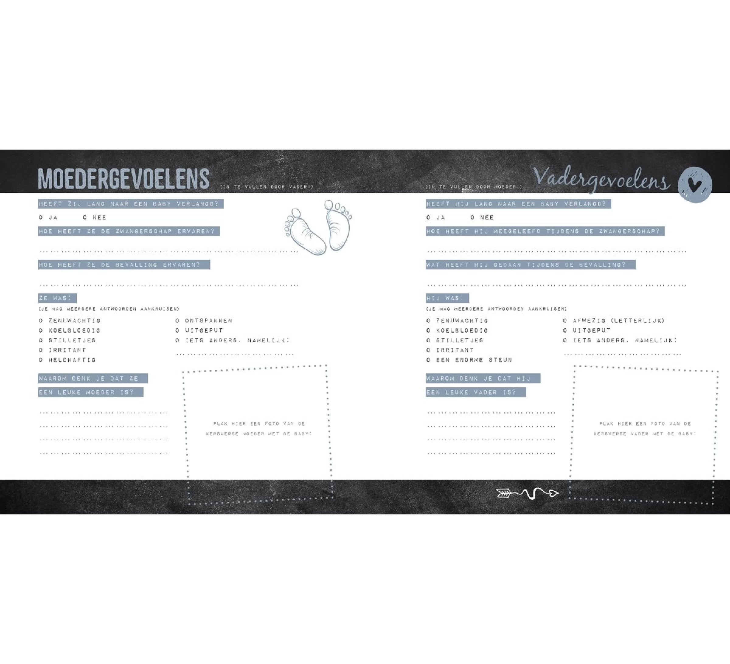Noteer in het eerste jaar van je baby alle mooie, grappige, leuke, lieve en bijzondere dingen over de baby, jouzelf en de omgeving. Vink lijstjes af en creëer een unieke herinnering voor jezelf, je baby en voor iedereen die nu of later een belangrijke rol speelt in het leven van je kindje.