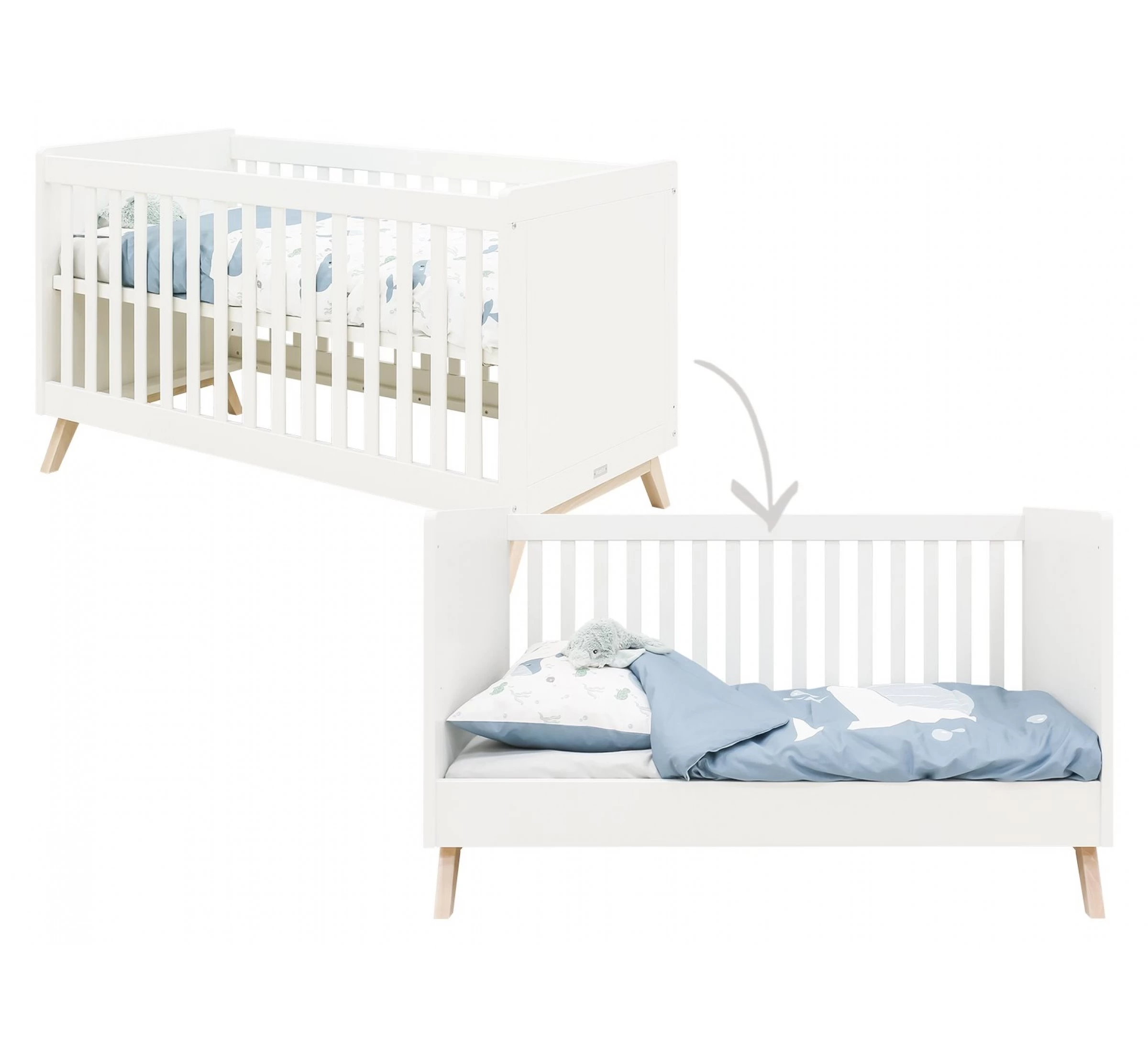 Dit babybed uit de serie Fenna van Bopita is om te bouwen van een ledikant met spijlen naar een peuter bedbank zodat de kleine zelf kan in- en uitstappen en hieraan kan wennen. Bedbodem, spijlenrek en lage zijde voor de bedbank worden standaard meegeleverd. De bodem van het spijlenbed is in hoogte verstelbaar. Omdat het bed in beide varianten 70×140 cm meet, heb je genoeg aan één matras. Doordat het bed om te bouwen is, heb je extra lang plezier van dit bed.