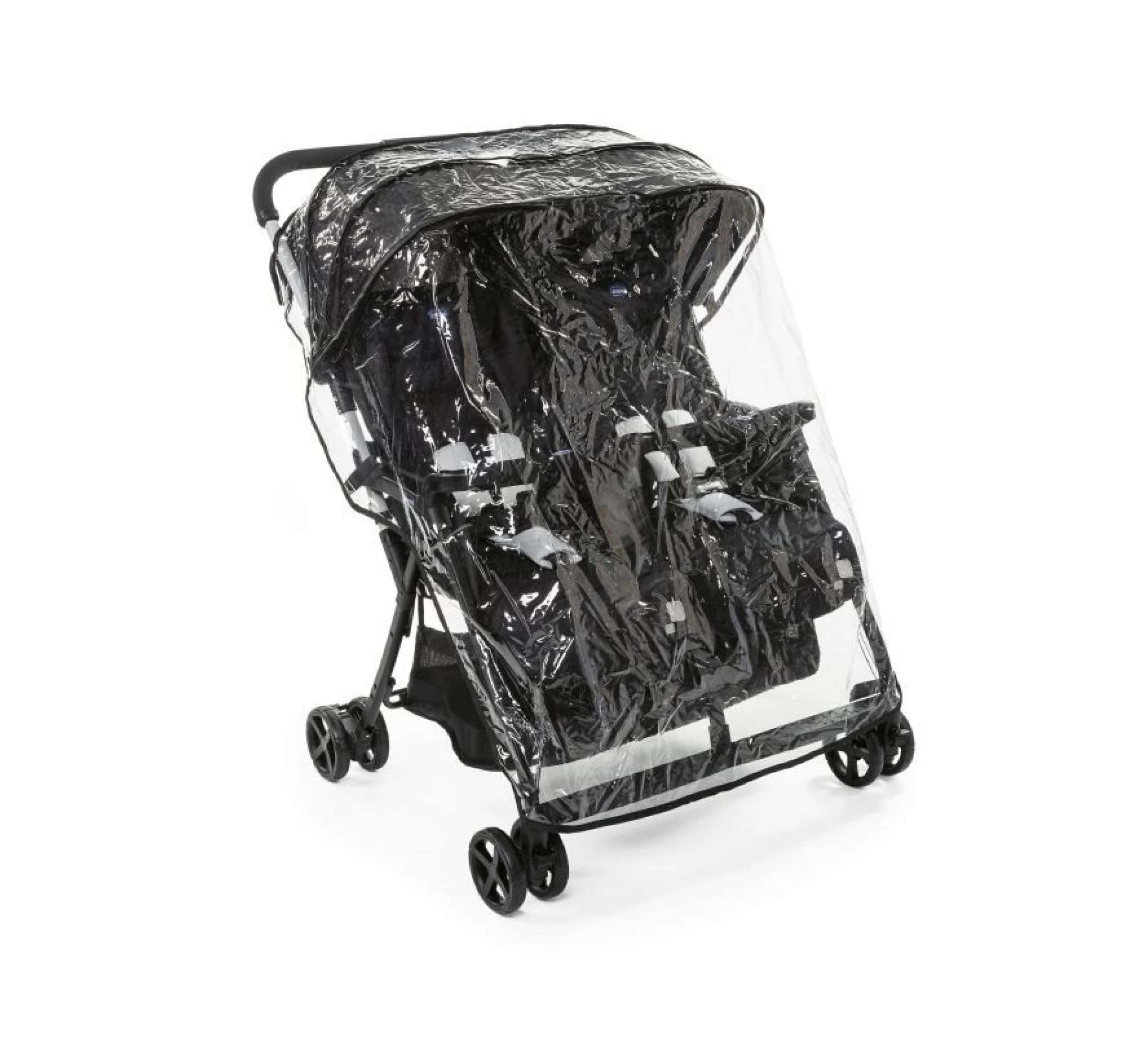Deze Chicco Ohlala tweeling buggy, speciaal voor tweelingen, is ultralicht en ultracompact! Gemakkelijk te hanteren, te besturen en te vervoeren. De buggy is met een hand in te klappen en kan zelf rechtop blijven staan. Dankzij de volledig verstelbare rugleuning, de verstelbare voetensteun en de uitklapbare (dankzij geintegreerde rits) zonnekap liggen je kindjes altijd comfortabel. Hiernaast heeft de buggy ook twee veiliheidsbogen en gewatteerde bekleding. De buggy zelf weegt slechts 8 kg. en is geschikt voor 2 kindjes tot 15 kg. Afmeting: 74,5×28,5x63cm. Inclusief regenhoes.
