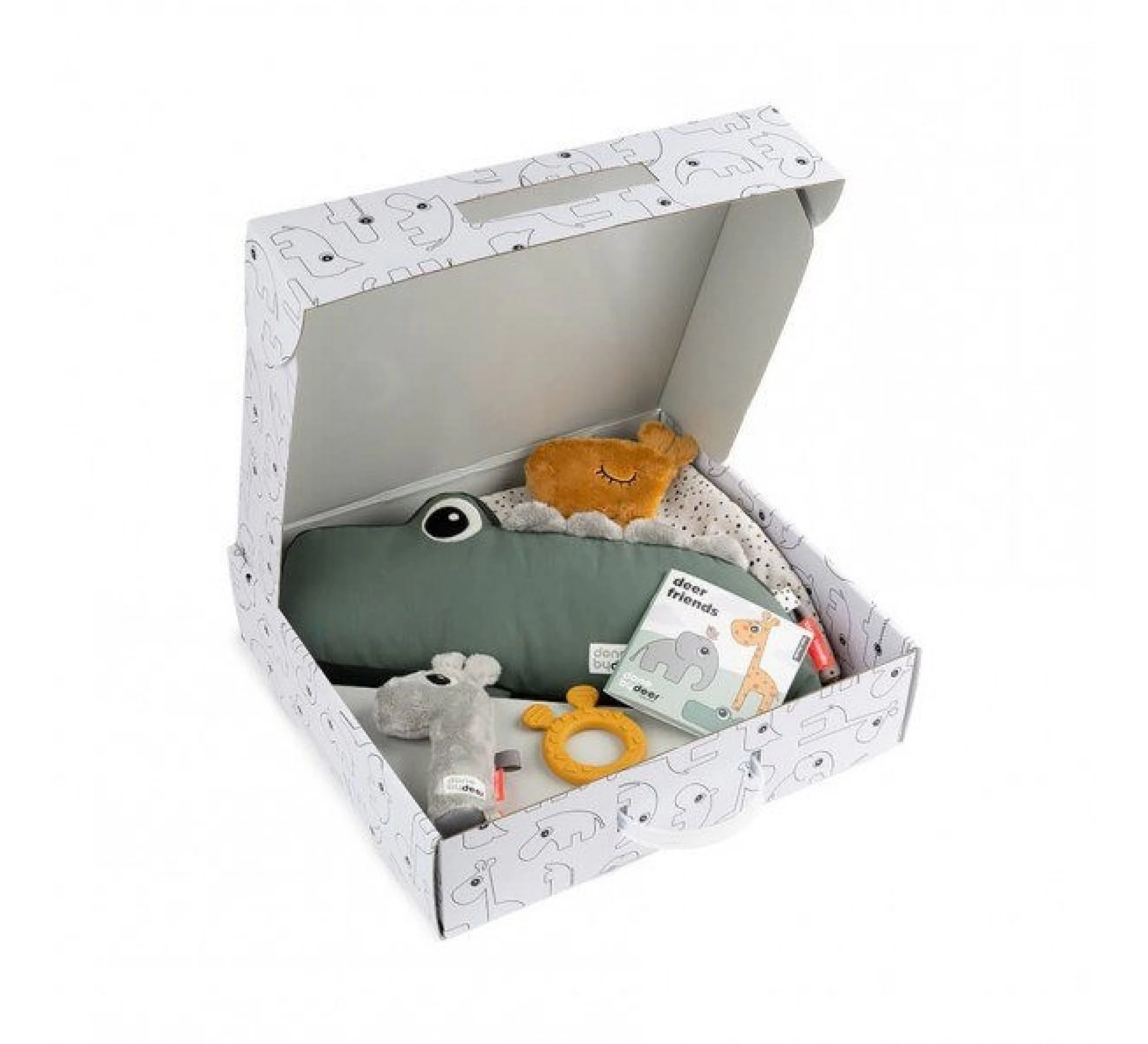 Met de Play time goodiebox krijg je vier van de Done by Deer baby musthave speelgoed gecombineerd in één schattige geschenkdoos.