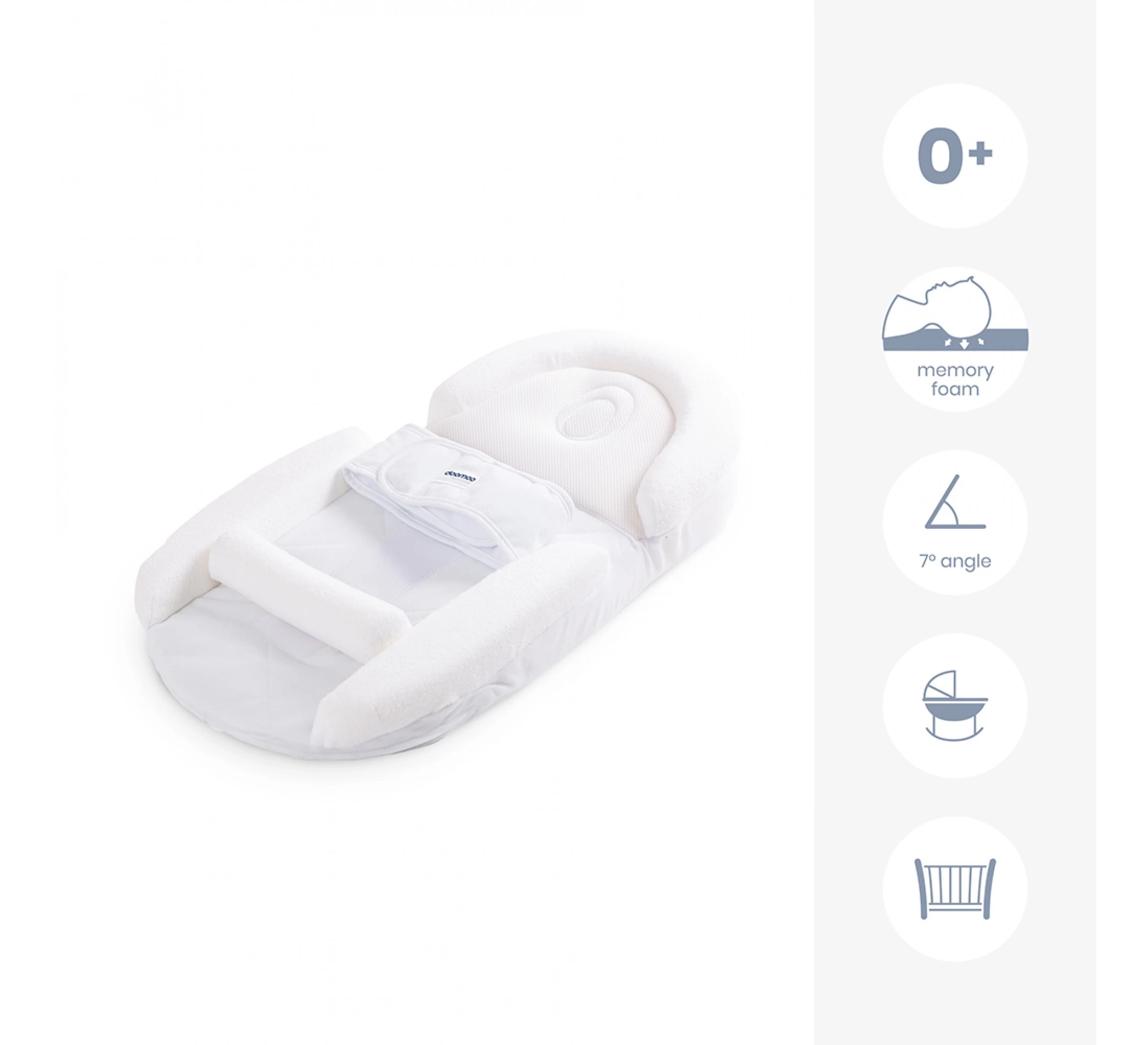 Het doomoo slaapnestje is de ideale oplossing om je baby knus op zijn rug te laten slapen en een optimale slaapkwaliteit te garanderen. Specialisten stemden het ontwerp af op de lichaamsbouw van baby’s, zodat ze in de beste omstandigheden kunnen slapen. De helling bevordert een goede spijsvertering en een comfortabele ademhaling, het visco- elastische schuim in het bovenste geldeete vermindert het risico op een afgeplat hoofd bij rugligging. De gordel houdt de baby veilig op zijn plaats en geeft een geruststellend en geborgen gevoel. Met de onderste, verwijderbare rol kun je baby’s beentje in foetushouding leggen waardoor krampjes verminderen.