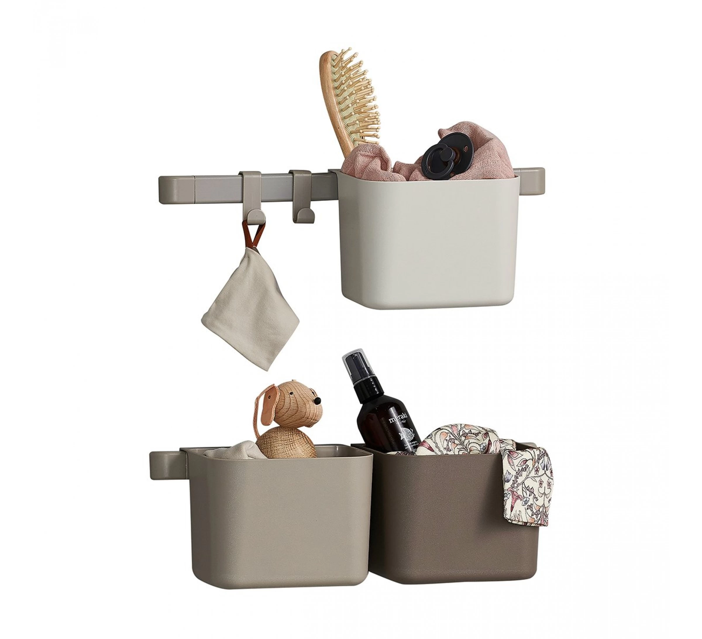 Met deze twee rekjes kun je praktisch spulletjes opbergen in de megeleverde bakjes. Bevestig de rekjes boven de Leander Matty aankleedkussen zodat je snel alles bij de hand hebt voor het verschonen van je kindje. De kleuren van de bakjes zijn op elkaar afgestemd zodat ze mooi bij elkaar passen. Deze set wordt geleverd met drie bakjes, twee rekjes en haken om de bakjes aan op te hangen.