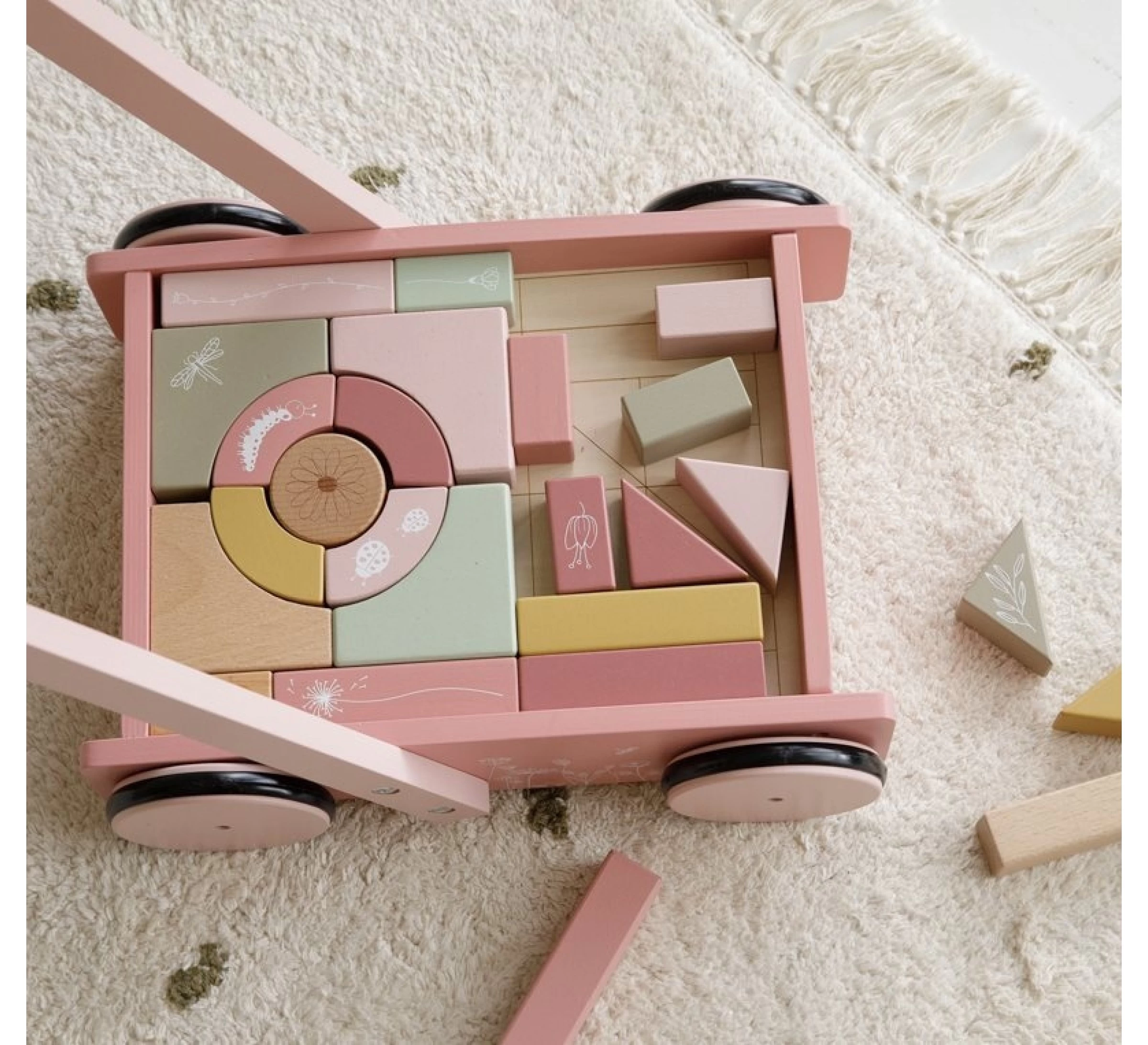De Little Dutch blokkenkar is voorzien van houten wieltjes en gevuld met gekleurde houten blokken met daarop prachtige tekeningen van bloemen en insecten uit de Wild Flowers collectie. De verschillende maten van de blokken bevorderen de herkenning van kleuren en vormen door kinderen. Het handvat zit op de juiste hoogte voor peuters zodat ze fijn door de kamer kunnen stappen. Deze vrolijke kar vol blokken staat garant voor urenlang bouwplezier.