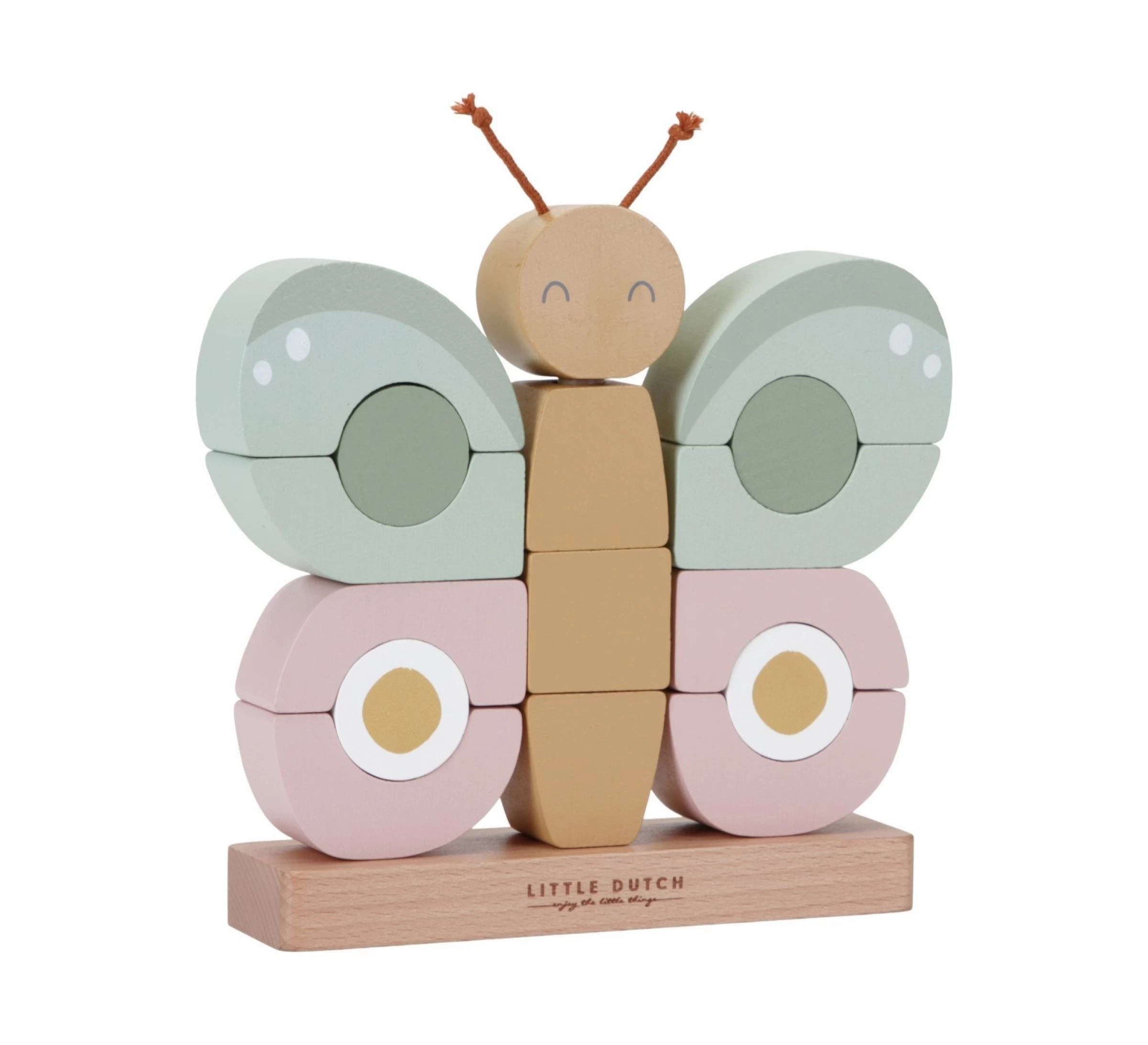De vlinderstapelaar ondersteunt de oog-handcoördinatie van je kindje en staat leuk als decoratie in de kinderkamer.