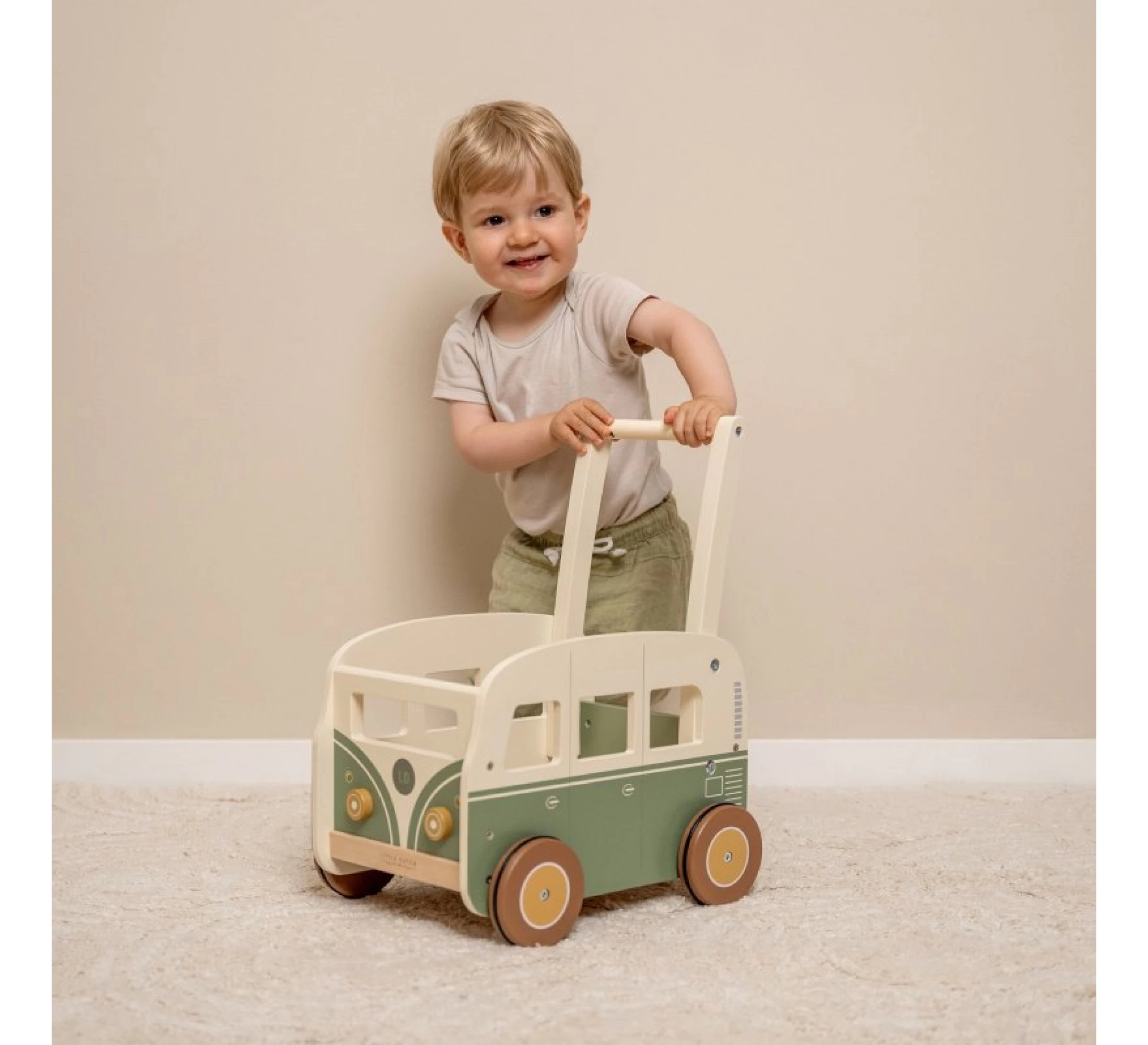En hop, daar ga je! Op avontuur door de woonkamer met deze Vintage loopwagen van Little Dutch. Stap voor stap leer je lopen, en deze duwkar helpt je erbij. Dus start je motor en doe net alsof je de bestuurder bent van deze super coole bus.