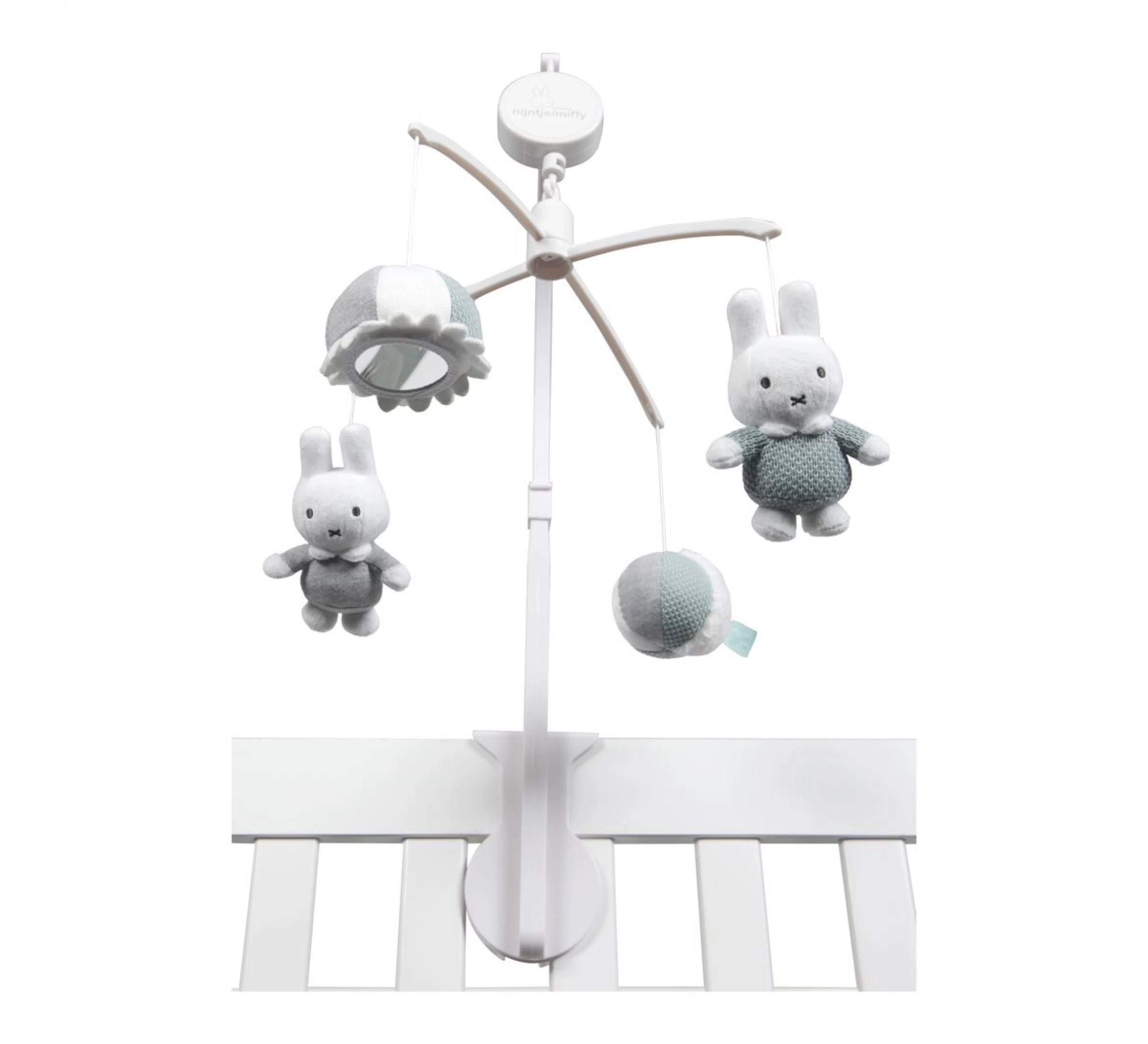 De muziekmobiel van Nijntje is eenvoudig te bevestigen aan de box. Het heeft één melodie: Brahms Lullaby. Aan de mobiel hangen vier speeltjes: twee konijntjes, een balletje en een spiegel. Een muziekmobiel werkt rustgevend voor de baby en leert je kleintje om te leren kijken en te volgen.