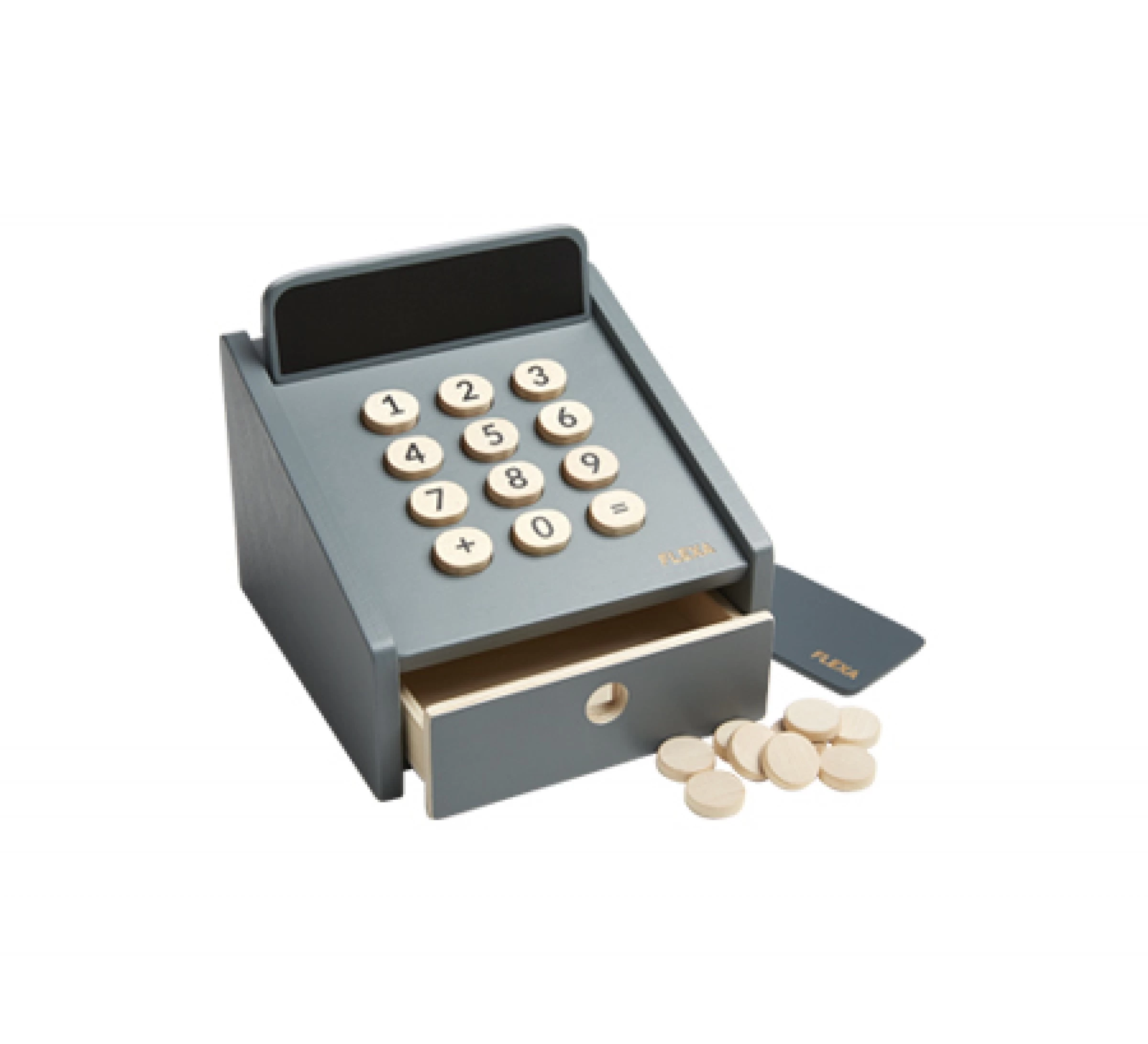 Er moet natuurlijk wel wat verdient worden als je een eigen winkel hebt. Een kassasysteem zorgt ervoor dat je kindje zijn of haar verkoopwaren met de klanten kan afrekenen. Deze kassa bestaat uit 12 onderdelen; de kassa zelf, tien houten muntstukken en een houten pinpas. Al deze onderdelen zijn gemaakt uit berkenhout.