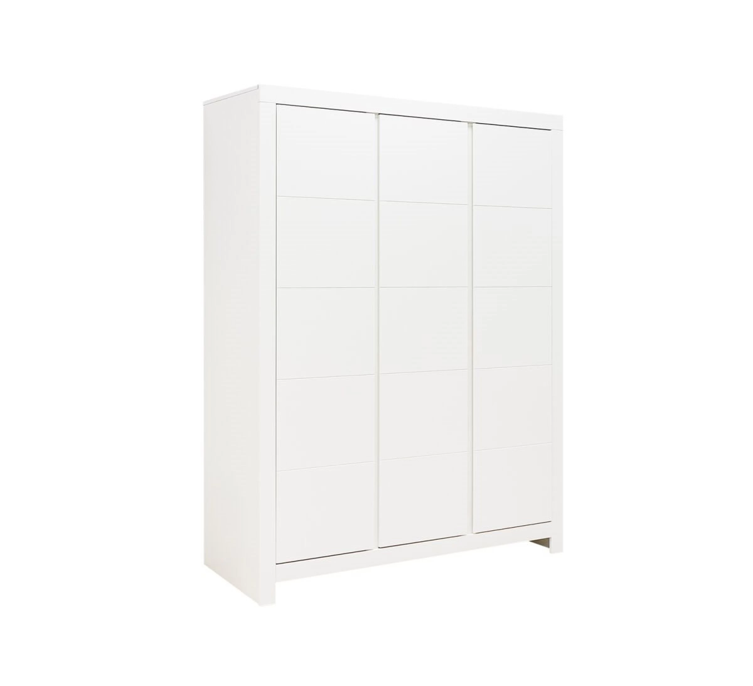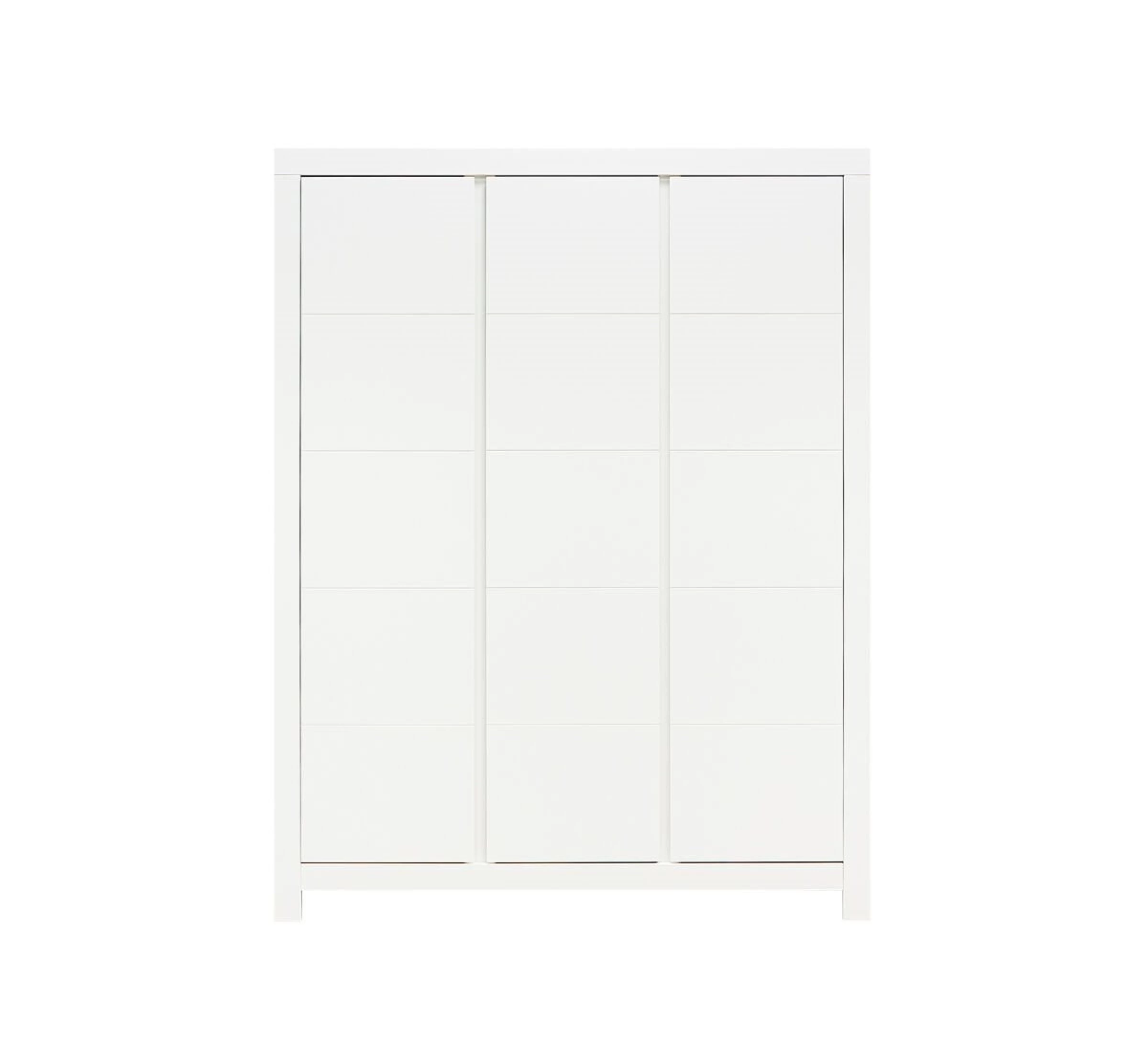 Moderne 3-deurskast van de serie Thijn. De deuren zijn greeploos uitgevoerd en zijn voorzien van subtiele horizontale groeven. Het interieur bestaat uit drie vaste schappen, drie hangroedes en 3 in hoogte verstelbare legplanken.